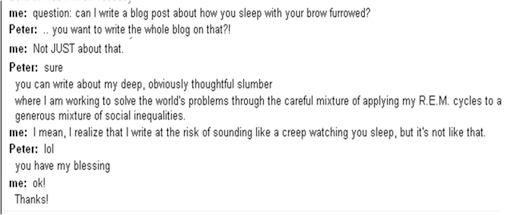 This thing \~/ is a representation of the furrowed brow he has when he’s sleeping. He like, looks like he’s confused about something, or thinking really hard. As I’m typing this, I’m furrowing my brow. I look like this: