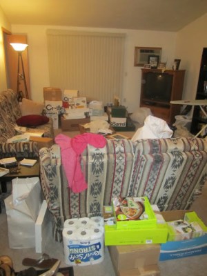 | Maybe because I can’t even put the ironing board away after I iron (right side of the picture). And I just KNOW that there’s a carpet under all of those boxes SOMEWHERE… |